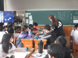 6年生、国語の授業風景。今は、先生が前からしゃべって教える授業ではなく、答えが難しい課題に対して、仲間のいろんな意見や考え方を聞きながら話し合い、誰もが納得するような答えを探す授業の時間が増えています。