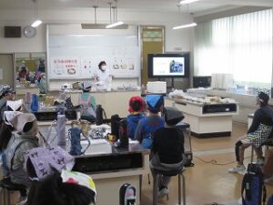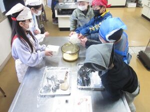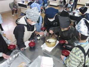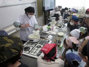 今日は、うーやん亭さんに来ていただき、とうふ作り体験をしました(2クラス)。豆乳に、にがりを加えて混ぜ、レンジで温めて作りました。作り立ての、やわらかくおいしいとうふを味わいました。国語で学習した「すがたをかえる大豆」を実際に体験できました。(あとの2クラスは2月4日にします)