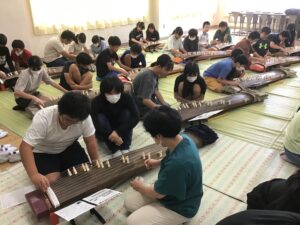 9月28日(木)、三重県生涯学習センターによる「文化体験プログラム」として、6年生が箏の学習をしました。箏の大師範である比留間先生と、ご子息正人先生に来ていただき、箏の歴史や演奏の仕方などを学びました。この日の音楽室は、17面もの箏が並び、先生の箏の演奏が流れる「和」の雰囲気に。いつもと違う音楽室に少し緊張した面持ちで入った子どもたちでしたが、箏を弾き始めると、みんな夢中になって練習していました。途中、正人先生が、十七弦箏でアニメソングを演奏すると、伝統的な和楽器で現代の曲想を表現できることにみんな驚いたようでした。最後は練習した「さくら」を合奏しました。