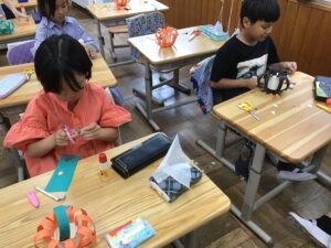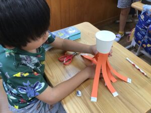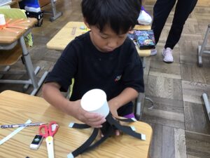 紙コップと色画用紙を使って、カラフルな小物入れをつくりました。はさみとものさしを使って、同じ幅に切り、それを紙コップにくるっと回して、端を飲み口にくっつけたら完成です。それぞれに、オリジナルの顔をつくり、素敵な作品が出来上がりました。お菓子でも入れて、おうちで使ってくださいね。