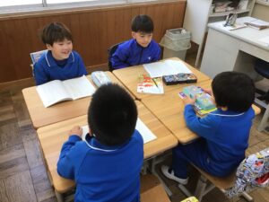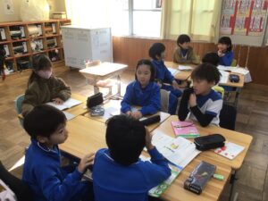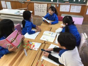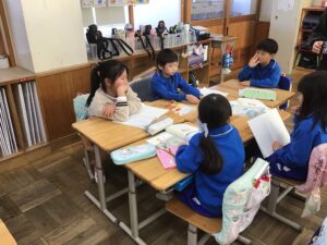 2年生は、国語の授業で「そうだんにのってください」を学習しています。今日は、事前に考えた友だちに相談したい話題をグループごとに発表し、友だちからアイディアをもらうグループ学習をしました。4、5人グループになって、1人がみんなに話題を伝え、残りのメンバーがそれに対して意見を伝えました。どんな話題が上がったかというと、、、「おねえちゃんが自分のお菓子を勝手に食べて困っています。どうしたらいいですか。」「朝寒くてなかなか起きられません。どうしたらいいですか。」「食べ物の好き嫌いが多いので、どうしたら食べられるようになりますか。」などがありました。それに対して、みんな真剣に考えて、いろいろなアドバイスをしていました。振り返りでは、もらったアドバイスを試してみようという意見が多くありました。