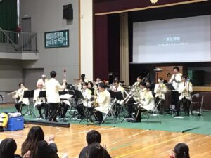 その後、音楽隊の方々に、素晴らしい演奏を聴かせていただきました。となりのトトロメドレーやミセスグリーンアップルメドレーなど、子どもたちがよく知る曲をたくさん演奏してもらいました。子どもたちは手拍子をしたり音楽に合わせて体を揺らしたりしながら楽しんでいました。