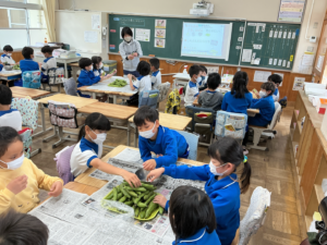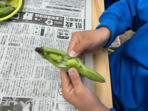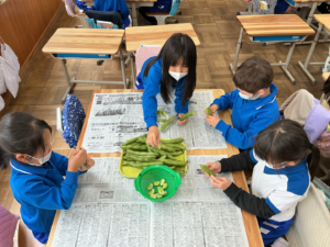 4月27日(月)、生活科の授業で、「そら豆のさやむき」を体験しました。
